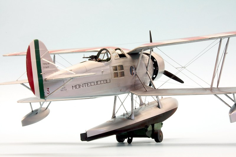 Nachdem die Adaption zum Seeflugzeug anscheinend ohne Schwierigkeiten über die Bühne zu bringen war, wurde die Ro.43 ab 1937 zum Standard-Bordflugzeug auf den Kreuzern und Schlachtschiffen der italienischen Marine. In dieser Rolle hatte sie auch ihren Anteil an allen größeren Gefechten des Kriegs im Mittelmeer. Selbst nach der Kapitulation Italiens war die Nutzung der Ro.43 noch nicht zu Ende: einige in Spanien internierte Maschinen sind noch bis in die 50er Jahre geflogen worden. Mein Modell zeigt eine Maschine des Kreuzers „Montecuccholi“ aus den Vorkriegsjahren in der 1937 eingeführten Lackierung für Bordflugzeuge, die vor allem durch ihre breiten roten Streifen auf silbernem Untergrund besticht.