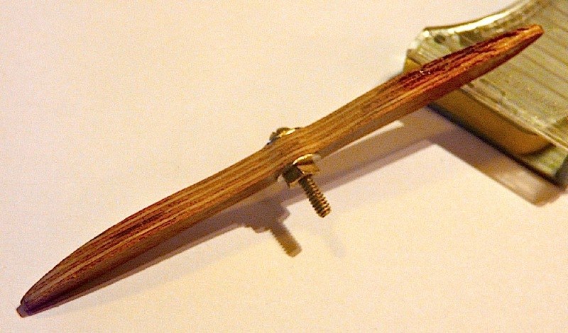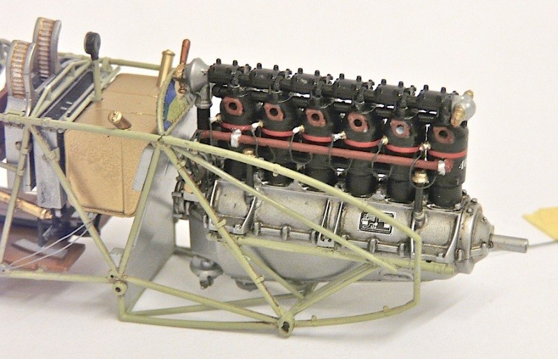 Nun zum Motor. Hier kamen diverse 'after-market' Produkte der Firma Taurus zum Einsatz. Im Einzelnen waren dies Zündkerzen, Überwurfmuttern und Vorfüllventile. Alles Weitere habe ich aus Kupfer- und Stahldraht verschiedener Durchmesser und Messingrohr gesratcht. Dazu gehört zum Beispiel auch das Übertragungsgestänge vom Cockpit zum Motor. Bemalt wurde der Motor mit Farben von Tamiya, Revell und Alclad. Zu diesem Zeitpunkt wuchs in mir der Wunsch, dem Modell einen echten Holzpropeller zu gönnen. Da ich sowas noch nie gemacht hatte, wollte ich anfänglich einen fertigen Propeller kaufen, aber was ich da so im "Netz" fand, gefiel mir nicht wirklich. Ein Emailfreund aus Bristol, Peter Vill, ermunterte mich dazu, es doch selbst mal zu versuchen und bereits der zweite, aus vier Schichten Mahagoni und drei Schichten Ahorn laminierte, Propeller war in meinen Augen so gut gelungen, dass ich keinen dritten mehr zu machen brauchte. Die Propellernaben habe ich von den Originalbauteilen abgeformt und anschließend in Resin gegossen. Nochmals danke schön für die Ermunterung, Peter!