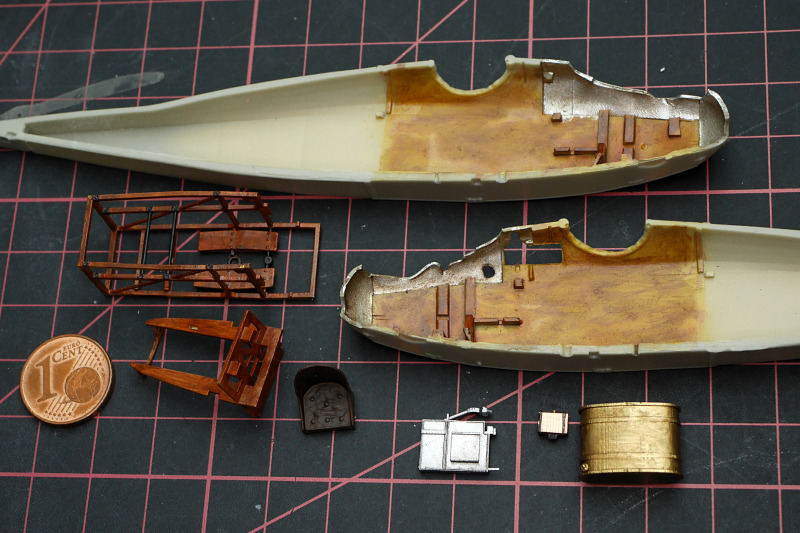 Tragflächen und Rumpf waren bereits von den Angüssen getrennt. Der innere Rahmen, Tank und der zweiteilige Sitz sind wie alle anderen Teile im 3D-Druck hergestellt und müssen vorsichtig von den Stützen getrennt werden. Der Motor aus dem Bausatz zeigt schöne Details und wurde nur mit einigen Drähten ergänzt.