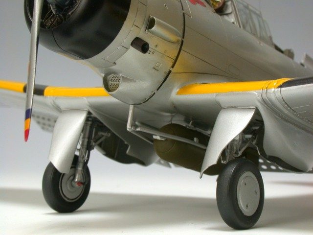 Auch das Fahrwerk hatte eine andere Konfiguration und zog halb nach hinten in die profilierten Verkleidungen ein. Das Seitenleitwerk war runder, lief ohne Finne aus und wurde im Modell mittels Plastik, Sekundenkleber und Farbe (3 Schichten Füller) modelliert. Das Höhenleitwerk war kleiner in der Spannweite und etwas tiefer als bei der SBD und konnte hingegen relativ leicht modifiziert werden.