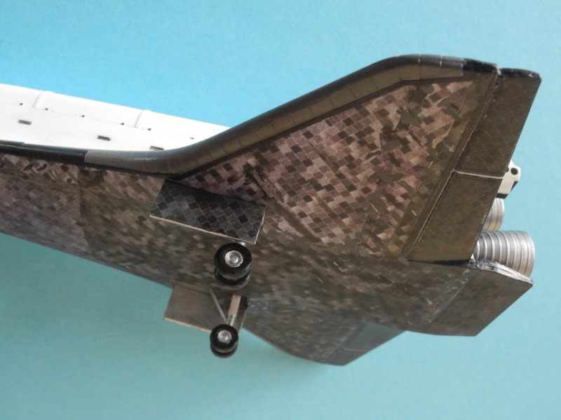 Mein ModellEin Modell in 1:200 kann natürlich mit jenen im größeren Maßstab, z.B. 1:72, nicht mithalten. Aber dieser Bausatz lag schon jahrelang bei mir im Schrank, außerdem ist das Space Shuttle relativ groß, in 1:1 über 37 m lang, das sind in 1:200 immer noch 18,5 cm. Und so lang ist das Hasegawamodell, auch die anderen Abmessungen sind maßstabsgetreu. Maßstabsbedingt ist halt die Detaillierung eher spielzeugmäßig als Scale-Modellbau. Besonders der Laderaum mit seinen aufklappbaren Ladeklappen hat mich sehr an Spielzeug, oder auch an die Frühzeit des Modellbaus erinnert. Dafür passen alle Teile mit japanischer Präzission zusammen. Die Decals sind korrekt, aber sehr sparsam. Hier habe ich im Web Decalsätze für den größeren Maßstab gefunden, nach deren Vorbild ich einige Ergänzungen für mein Modell herstellte: die etwas komplizierte Trennlinie zwischen weiß und schwarz am Bug, und die Hitzeschutzkacheln an der Unterseite und auch ein paar Details an der Tragflächenoberseite. Und das sieht dann so aus: