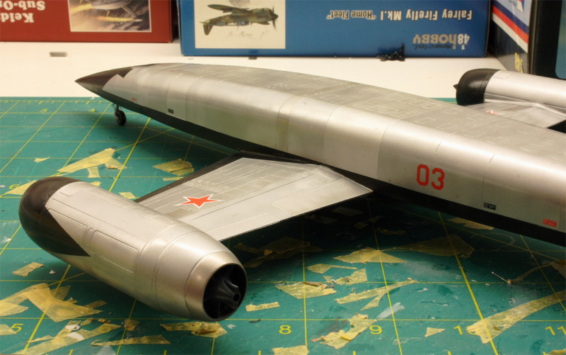 Allzu viel an Detailierung sollte man von diesem ansonsten stimmigen Bausatz nicht erwarten. So bleiben die Fahrwerkschächte weitgehend leer, auch die Fahrwerkbeine überlassen vieles lieber der Vorstellungskraft des Betrachters, als mit Details zu protzen. Gelungen sind dagegen sicherlich die Schubkegel der beiden Triebwerke an den Flächenenden. Diese werden als Resinteile geliefert und machen, einmal montiert, eine gute Figur.