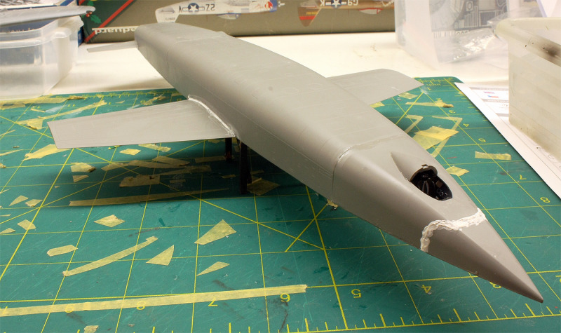 Der Bau selbst ist nicht sonderlich kompliziert und geht ebenso zügig wie unkompliziert von der Hand. So sind die auf den Baufotos sichtbaren Spachtelmassen auch eher der Gewohhnheit als der Notwendigkeit geschuldet. Dem Bausatz liegt ein Decalbogen mit mehreren Markierungsvarianten fiktiver deutscher Einsatzmaschinen bei. An deren Bau war mir allerdings nicht gelegen: ich wollte anstelle eines Interkontinentalbombers eine möglichst nicht-militärische Variante entstehen lassen.