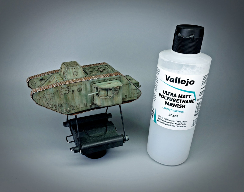 Die Farbgebung:Bei der Sichtung diverser Originalbilder fand ich es schon überraschend, dass dieser einzige Prototyp einen doch eher abgenutzten Eindruck machte. So sieht man hier auf den alten Schwarz/Weiß-Bildern einen A7V-U, bei dem ein grüner Grundanstrich anscheinend sehr gelitten hatte. Ob es an den damaligen Rohstoffmangel in Verbindung mit einem schlechten qualitativen Anstrich handelte oder eben die Erprobung dementsprechend hart war, konnte von mir nicht ermittelt werden. Doch musste dies bei der Farbgebung unbedingt berücksichtigt werden. Wie schon weiter oben erwähnt, basierte der A7V-U auf dem Fahrgestell 524. Die dementsprechende Kennzeichnung war auf der vorderen Wannenfront sowie im Heckbereich zu finden. Da der Bausatz keine Decals enthielt, musste ich nun bei meinen Decalresten nach Abhilfe suchen. Fündig wurde ich dabei bei den Decals, die Bestandteil des schon vor geraumer Zeit gebauten PzKpfw 38t von HobbyBoss gewesen waren. Die Ex-Turm-Nummerierungen mussten nur noch passend ausgeschnitten werden und benötigten einen schwarzen Untergrund. Dementsprechend verwendete ich hier schwarze Grundierung und klebte den Bereich punktgenau ab, auf dem später die Nummerierung ihren Platz finden sollten. Nun war es Zeit für die Grundfarbgebung. Als Basis dienten hier eine 50/50-Mischung von „Dull Green“ (A.MIG-0077) und „RAL 7008 Graugrün“ (A.MIG-005), welches ich z.T. noch mit einem „Sand Grey“ (A.MIG-0067) leicht aufhellte, um hier eine diskontinuierliche Farbgebung zu erhalten. Anschließend folgte ein „negatives“ Drybrushing. Negativ in der Hinsicht, da hier in Anlehnung am originalen Vorbild anstatt eines helleren ein dunklerer grüner Farbton verwendet wurde (Humbrol 30/ Dunkelgrün). Um die grüne Grundfarbgebung weiter aufzubrechen, kam nun noch ein helles Grün (Revell 45/ Helloliv) zum Einsatz, mit dem ich ein herkömmliches, aber sehr dezentes Drybrushing durchführte. Dabei erhielten auch die Laufketten ihre erste Farbgebung mit Pinsel und diversen Rost- und Metallfarbtönen. Nun konnten die Abklebungen für die Decals entfernt und diese aufgebracht werden. Anschließend wurde das ganze Modell mit einem Acryl-Glanzklarlack versiegelt, um die aufgebrachten Decals vor Beschädigungen zu schützen und eine gute Basis für die folgenden Alterungsarbeiten zu schaffen.