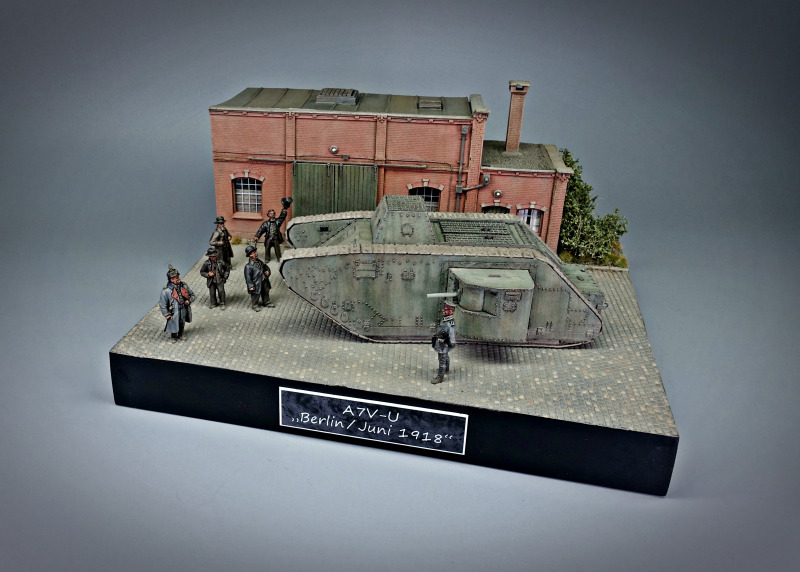 Das Diorama:Wie bei all meinen vergangenen Arbeiten hatte ich auch hier schon im Vorfeld ein gewisses Bild vor Augen, wie das passende Diorama für den A7V-U aussehen sollte. Da es hier nur einen Prototypen gegeben hatte, dieser nur Fahrerprobungen und Tests unterzogen wurde, fiel schon mal eine typische Westfront-Darstellung flach. So bot es sich an, diesen Prototyp eben während dieser Erprobungsphasen im Umfeld einer Fabrik- oder auch Lagerhalle zu präsentieren. Hauptbestandteil sollte dabei eine Lagerhalle von Artitec spielen. Dieser Resinbausatz (Artikelnummer 10.307) schlummerte schon seit Jahren in meinen Schubladen und sollte nun zumindest in Teilen seine Bestimmung finden. Zwar ist dieser Bausatz eher für den Modelleisenbahn-Bereich gedacht (Maßstab 1/87), doch kann man diesen durchaus auch in dem etwas größeren SmallScale verwenden. Dabei war schon im Vorfeld klar, dass hier nur ein Teilabschnitt dieser Lagerhalle Verwendung finden sollte. Also mussten die genauen Abmaße ermittelt und auch skizziert werden. Anschließend begann ich zuerst mit der Lagerhalle, die ich mir nun passend zurecht schnitt und montierte. Da das Gebäude in dem späteren Holzrahmen aus Balsaholz eingepasst werden sollte, entstand hier auch die meiste Arbeit. Als Basis dienten eine passende Holzspannplatte, sowie 3mm dickes Balsaholz, welches ich für den Rahmen verwendete. Des weiteren fand ich in meinem üppigen Sortiment das passende Kopfsteinpflaster (Kibri/ 21-34124). Auch hier erfolgten genaue Anpassungsarbeiten an der Grundplatte. Die jeweiligen Übergänge des Gebäudes und des Kopfsteinpflasters wurden dabei verspachtelt und verschliffen, um einen sauberen Übergang zu erzielen. Eine kleine Freifläche seitlich am Gebäude wurde mit Bodengrund in Form von Vogelsand und Heilerde gestaltet. Der Dachbereich der Lagerhalle wurde dabei noch nicht montiert, da ich hier später noch den Zugang zu den Fensterbereich benötigte. Nun konnte man mit der Farbgestaltung beginnen. Den Anfang machte dabei eine schwarze Grundierung, wobei hier auch die Innenbereiche der Gebäude nicht ausgenommen wurden. Anschließend erfolgten alle weiteren Arbeiten weitgehend mit dem Pinsel. Während das Ziegelgebäude einen gewissen Ziegelfarbton erhielt, arbeitete ich beim Kopfsteinpflaster mit verschiedenen Grautönen.Bei der Alterung und dem Hervorheben bestimmter Farben, arbeitete ich ähnlich, wie schon bei der Alterung des A7V-Us. Auch verwendete ich hier fast die gleichen Farben. Während ich bei dem Gebäude ehe dezent vorging, erhielt das Kopfsteinpflaster dabei ein kräftiges Drybrushing mit meinem „Lieblings-Drybrushing-Farbton“ Revell 89. Da nun wieder Pigmente und White Spirit zum Einsatz kommen sollten, musste gerade das Kopfsteinpflaster zum Schutz mit einem Acryl-Glanzklarlack überzogen werden. Den Acryllack muss man dabei grundsätzlich als eine Art Schutzschicht sehen, um den vorherigen Farbauftrag vor Beschädigungen zu schützen, wenn diverse Lösungsmittel in „größeren“ Mengen verwendet werden. Bei den Pigmenten griff ich dabei auf die gleichen Produkte zurück, die auch schon bei dem Panzer zum Einsatz kamen. Während ich im Bereich des Bodengrunds mit einem Pigment-Fixer arbeitete, verwendete ich im Kopfsteinpflasterbereich vorwiegend den White Spirit. Dabei brachte ich mit einem Pinsel zuerst die Pigmente mehr oder weniger lose auf und bearbeitete diese dann „nass“ mit dem White Spirit. Anschließend wischte ich den Überschuss immer wieder mit einem Papiertuch ab, bis ich mit dem Ergebnis zufrieden war.Nun konnten auch die Fensterscheiben von innen des Gebäudes mit Holzleim montiert werden. Dabei setzte ich noch kleine Akzente, in dem ich die großen Fensterbereiche von innen teilweise mit einer Bretterwand versah. Das Fenster des Anbaus erhielt dabei eine Gardine. Dafür druckte ich mir eine passende Vorlage in der richtigen Größe auf herkömmlichen Druckpapier aus und montierte auch diese mit Holzleim an der vorgesehenen Stelle. Nun konnten auch endlich die Dächer ihren Platz einnehmen.Im Bereich des Bodengrunds wurden noch einige Gräser und etwas Buschwerk gesetzt, was die Gesamtszenerie ein wenig auflockerte. Zu guter Letzt folgte wieder eine leichter Staubüberzug per Airbrush mit Tamiya „Buff“. Nachdem der Dioramensockel gesäubert war und das passende Typenschild seinen Platz gefunden hatte, waren die Arbeiten hier nun auch abgeschlossen.