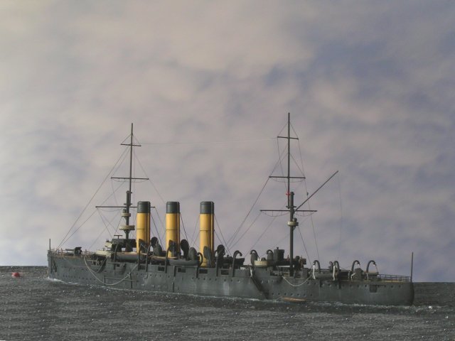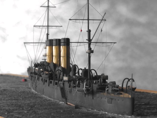 Die einzigen weiteren Ergänzungen, die ich gegenüber dem Basisbausatz vorgenommen habe, waren; erstens, Aufbohren der Kassematten im Mittelschiff; zweitens, Abtrennen der Reling an Brücke und Scheinwerferständen; drittens, Ergänzen der seitlichen Spierenanlage und viertens, Verwendung des WEM Ätzteilsatzes WEM PE724 WWI Light Cruiser/Destroyer. Diesen Satz habe ich doppelt benötigt, da pro Satz nur zwei kleine Schornsteingitter beiliegen. Da der Satz aber etliches sinnvolles Zubehör für alle Schiffe aus der Zeit der Jahrhundertwende vom 19. zum 20. Jahrhundert enthält, ist das eine nicht unnötige Anschaffung. Aus dem Satz fanden außer den Schornsteingitter Leitern, Reling und Gangway Verwendung. Bis auf die Reling an Brücke und Scheinwerferständen habe ich alle Ätzteile vor der Lackierung angebracht. Die noch fehlende Reling für die Brücke und die Stände wurden am Modell vorgebogen und anschließend mit Weißleim bestrichen, um so die Segeltuchabdeckung darzustellen die hier häufig angebracht war. Da diese eine andere Bemalung erhalten sollten als der Rest, wurde diese erst später am Modell befestigt. Nachdem alle Einzelteile Zusammengebaut bzw. die Kleinteile aus ihrem Gussansatz gelöst und versäubert waren, konnte die Lackierung erfolgen. Der Rumpf hatte zur Aufnahme zum Lackieren und späterem Händeln bereits vorab eine M4 Gewindebohrung erhalten. Die Kleinteile habe ich zum Handhaben auf kleine Stäbe aufgeklebt. Die Wahl der Farbe für eine schwarze Lackierung des Rumpfes bereitete mir einiges Kopfzerbrechen. Das Modell samt Oberflächenstruktur sollte schließlich nicht durch ein sattes Schwarz geschluckt werden. Meine Wahl fiel schließlich auf das Dunkelblaugrau KM03 aus dem WEM Colorcoats Programm. Diese nahezu schwarze Farbe ist als Anstrich für Unterwasserschiffe z.B. deutscher Schnellboote im Programm. Nachdem ich die Farbe aufgetragen hatte, erschien mir der Rumpf bei bestimmtem Lichteinfall eher grünlich als bläulich grau. Daher habe ich die Farbe mit reinem Schwarz und ein wenig Dunkelblau abgetönt und nochmals, aber nicht gänzlich deckend überlackiert. Das Farbmuster gefiel mir wesentlich besser als das erste und nachdem ich das ganze noch mit einem hellen Blaugrau abgetönt hatte, um diverse Aufhellungen aufzutragen, war ich mit dem Ergebnis recht zufrieden. Abschließend wurden die Schornsteine noch in einem angemischten gelben Farbton lackiert.