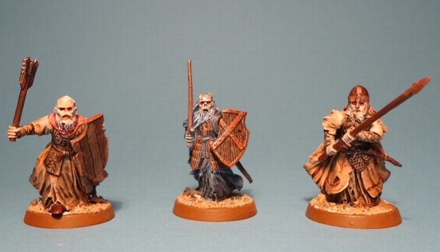 Bemalung-AusführungDie Bemalung erfolgte zum überwiegenden Teil durch Washes von Games-Workshop. Also verdünnten Farbbrühen, die keine deckende Schicht ergeben, sondern eigentlich nur zur Schattierung von tieferliegenden Schichten eingesetzt werden. Die Figuren wurden mit "Skull-White" grundiert und im ersten Schritt mit "Gryphonne Sepia" bzw. "Asurmen Blue" gewasht. Danach folgten an den dunkleren Stellen mehrere Schichten desselben Washes und stellenweise der Einsatz von "Badab Black", um gezielt tieferliegende Kleidungsschichten abzudunkeln. Die Figuren wirken dadurch allgemein oben heller und unten dunkler. Die Haare und Hautpartien wurden sparsam mit "Skull White" und "Elf Flesh" gebürstet und teilweise wieder mit "Gryphonne Sepia" gewasht, um mehr Farbschattierungen zu bekommen und alles wieder zu verschmelzen.