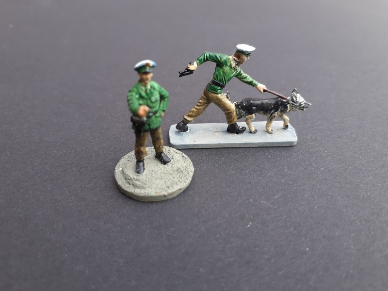 Leider gibt es im Maßstab 1:72 oder 1:76 keine Figuren vom deutschen Bundesgrenzschutz. Für einige meiner Wargames Aktionen aus der Zeit des "kalten Krieges" benötigte ich allerdings ein paar Grenzschützer. Als Basis dienten mir hauptsächlich Figuren von Airfix die leicht verändert wurden. Es befinden sich auch ein paar Figuren aus Metall darunter.