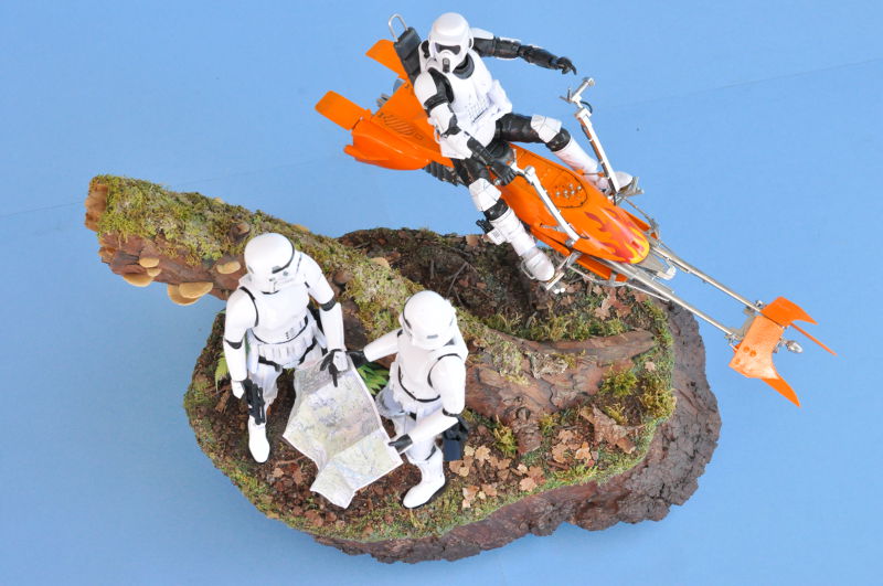 Vor einiger Zeit bin ich auf eine Karikatur mit einem aufgemotzten Speederbike und erstaunten Stormtroopers gestoßen. Das hat mich zu einem Star Wars Diorama inspiriert: Die beiden verirrten Stormtrooper versuchen auf einer Endor-Wanderkarte ihren aktuellen Standort zu finden. Zum Glück treffen sie auf einen ortskundigen Scout Trooper mit seinem heißen Chopper Bike.