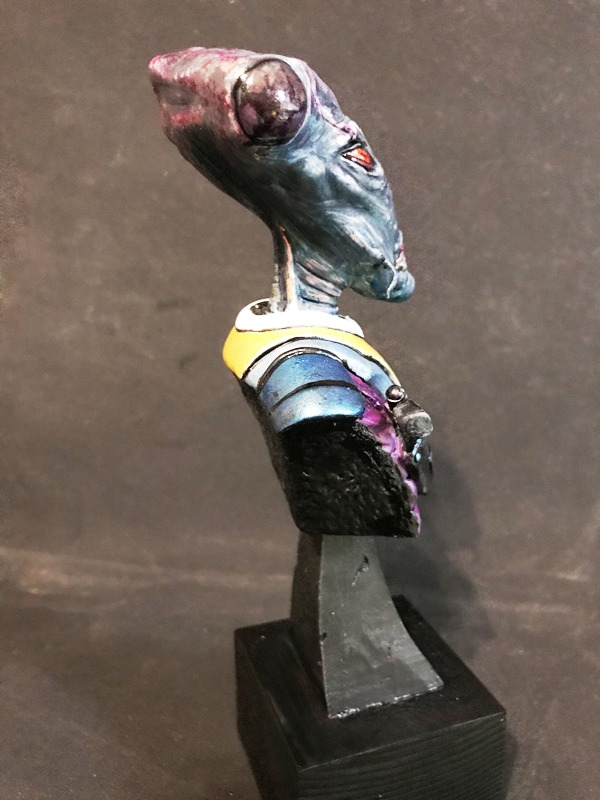 Diesmal habe ich eine Resinbüste für euch. Ich glaube, sie ist von JIVER, bin mir aber nicht sicher. Der Maßstab sollte 150 mm sein. Die Büste ist sauber gegossen, somit war hier wenig zu tun. Die beiden Follikeln am Kinn sind mir bestimmt achtmal abgebrochen, wie dumm man doch im Alter immer noch sein kann…. Gemalt habe ich wie immer Öl auf Acryl, wobei das Metall nur mit Acryl gemalt ist.