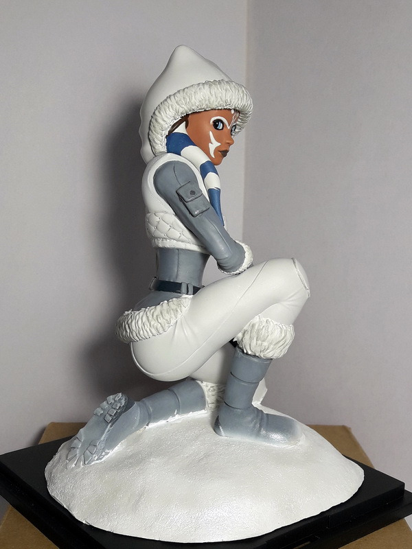 Der kleine Schneehügel, auf dem Ahsoka kniet, besteht aus lufthärtendem FIMO. Leider hat dieses FIMO die schlechte Eigenschaft, während des Aushärtens zu schrumpfen, hätte ich das vorher gewusst, hätte ich etwas anderes verwendet. Um etwas Struktur in den „Schnee“ zu bekommen, habe ich zerdrückte Alufolie verwendet, die ich vorsichtig in die weiche FIMO-Masse tupfte. Und um den Schnee etwas glitzern zu lassen, wurde der Sockel mit CREATEX pearlized White aus der Airbrush lackiert.
