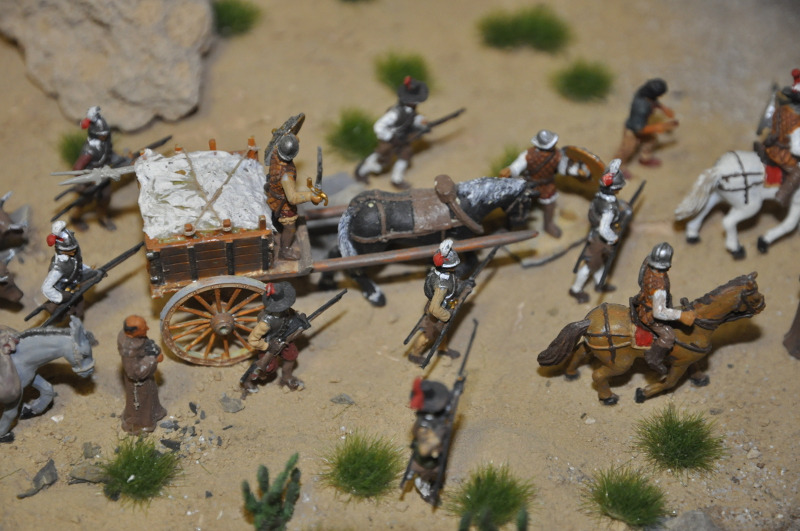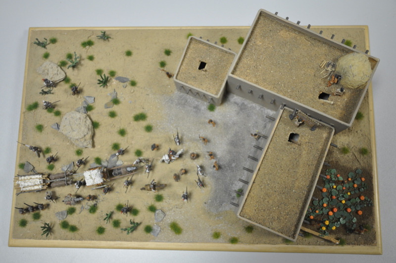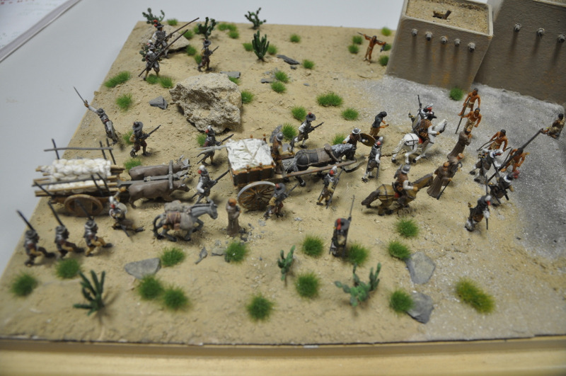 Verwendete MaterialienHäuser: Karton, Holzstäbe, Weissleim, Sand, Farben Revell Aqua Gelände: Kartonabschnitte, Fertigspachtel, gesiebter Löß, Estrichsand, Quarzsand, Tuffschrott, Schiefersplit, getrockneter Kaffeesatz, Weissleim. Auf gefaster Holzplatte mit Glassturz. Figuren: Conquistadores (Caesar Miniatures), California Mission Indians (Pegasus Hobbies), Kaiserliche Infanterie (Revell) Pflanzen: Grasbüschel (NOCH), Kakteen (Pegasus Hobbies), Kürbisse (Busch)