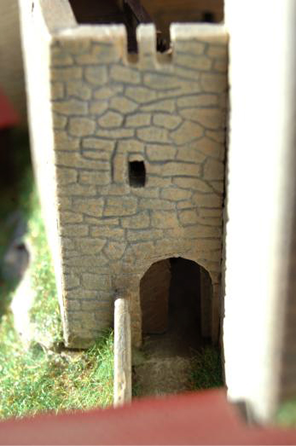 Die Mauern bestehen bei der Originalburg vorwiegend aus dem Kalkstein der Umgebung. Dieser Kalkstein wirkt im frisch gehauenen Zustand lehmgelb bis weißlich und bleicht mit der Zeit an der Oberfläche in Richtung Grau-Weiß aus. Ich grundierte zunächst mit Betongrau sämtliche Mauern, bemalte diese nach der Trocknung mit der Trockenmalmethode mit Lehmgelb und betonte die erhabenen Stellen nochmals mit Weiß. Dadurch ergab sich für die Mörtelspalten eine dunklere Farbgebung.
