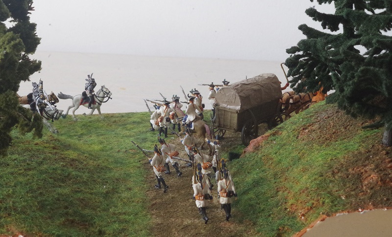 Im Zuge des recht wechselhaften Kriegsgeschehens wäre eine Situation, in der eine Reiterschwadron eine feindliche Marschkolonne samt Verpflegungswagen überrascht und angreift, gut vorstellbar.