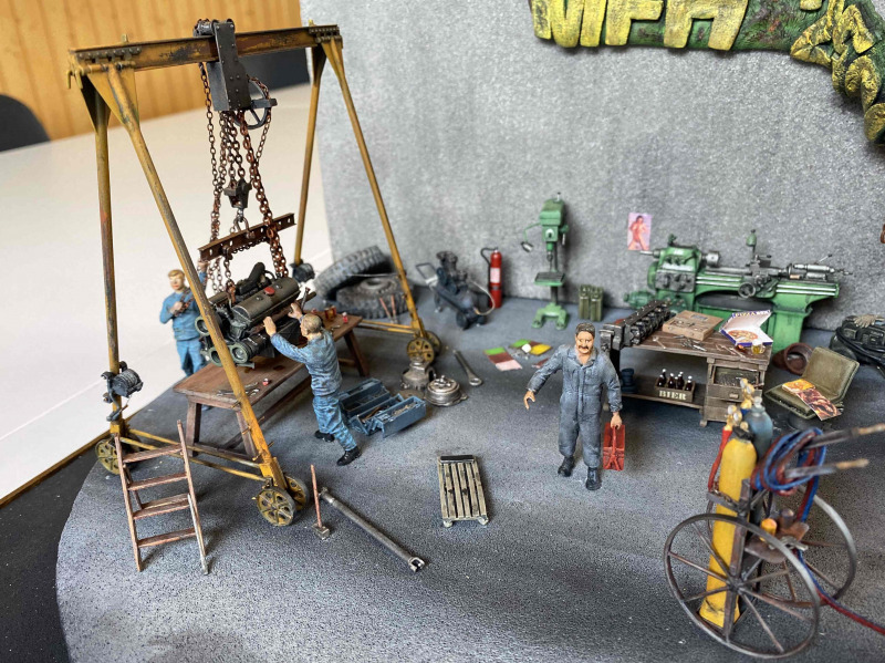 PrologDer Hintergrund der Werkstattszene ist mein 20-jähriges Jubiläum bei der Fa. Scherz Umwelt GmbH in Altenstadt/Wetterau. Während regelmäßiger Samstage (in anderen Kulturkreisen auch „Sonnabend“ genannt) ist eine gegenseitige Sympathie entstanden. Auch hat die selten gewordene Menschlichkeit in dieser Firma zu diesem Projekt animiert. Vielen Dank dafür! Ausgehend von dem Schriftzug „MFH 2500“, den der Modellbauer aus dem Brandschutt der zwischenzeitlich abgebrannten und neu errichteten Werkstatt „gerettet“ und jahrelang archiviert hat, ist die Idee geboren worden, eine Reparaturwerkstatt für Lkw, Bau- und Landmaschinen zu kreieren.