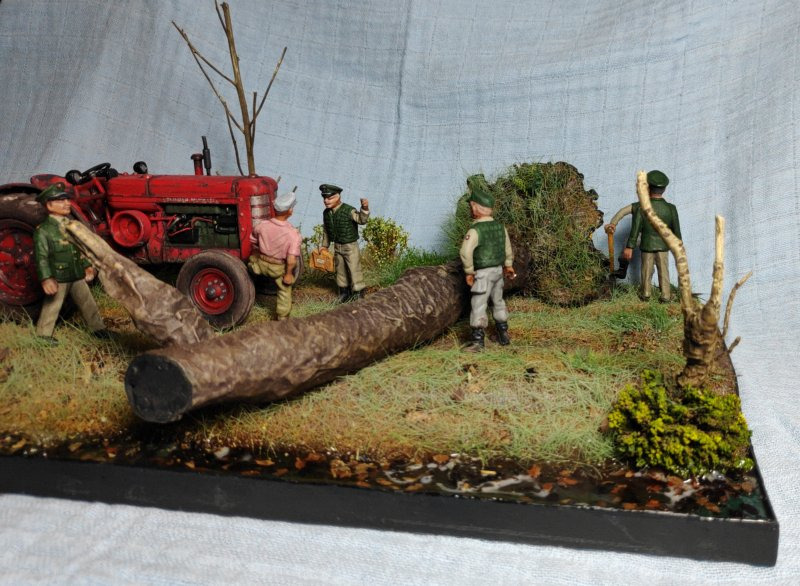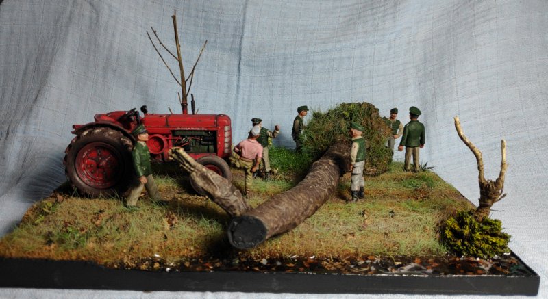 Damit war dann der Traktor fertig. Mit den Figuren war es nicht so einfach. Wirklich „richtige“ Figuren habe ich nicht gefunden. Also habe ich mir beholfen mit umgebauten Weichplastik-Figuren, die ich auch mal auf einem Flohmarkt ergattert hatte. Da das ganze in den 60ern des letzten Jahrhundert spielt, kann man mit etwas gutem Willen die Figuren als Polizisten durchgehen lassen. Zu den Weichplastik-Figuren kann ich nicht viel sagen, außer, dass sie grün sind und mich an US-Soldaten in Korea erinnern und in etwa zu 1:32 passen.
