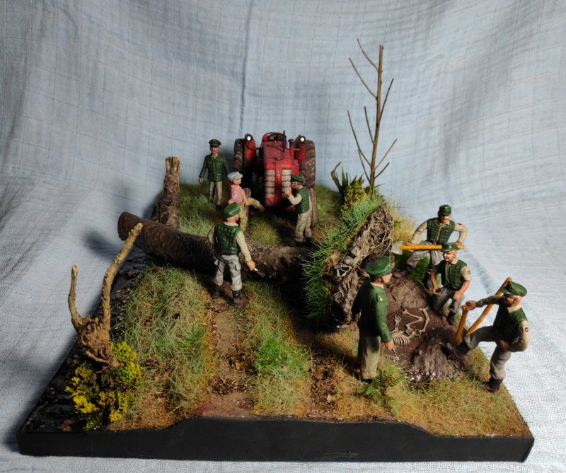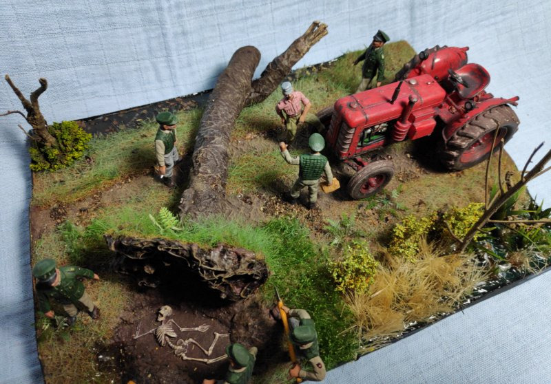 Dies ist eine rein fiktive Geschichte, die mir schon länger in Kopf herumspukte, als ich vor Jahren eher zufällig über die beiden Skelette in 1:35 von Verlinden gestolpert bin. Die beiden schliefen dann irgendwo zwischen meinen Modellen bis zu dem Tag, als ich auf einem Flohmarkt ein paar Traktoren gekauft habe. Ein paar für meine Enkel und der Bolinder Munktell 470 Bison von Atlas in 1:32 für Opa, also für mich. OK, ich kann euch schon hören, das ist doch kein Modellbau, das ist ein Fertigmodell – ja, stimmt, aber ein Dio habe ich dann doch gebastelt.