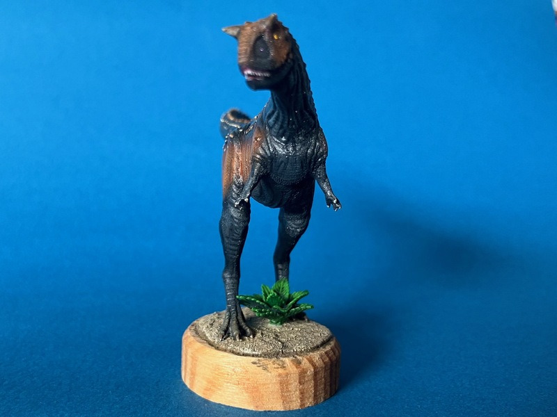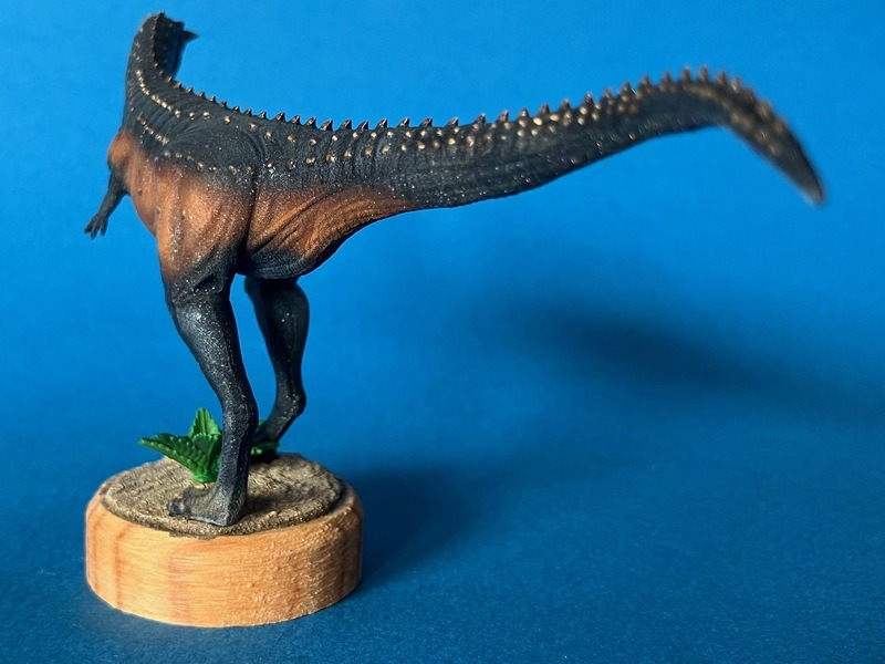 Das Modell ist von Manuel Bejarano und dazumal bei Shapeways gedruckt bestellt worden. Es ist leider ein Stück zu hochbeinig. Da das Material schwer zu bearbeiten ist, habe ich die Beine so belassen. Ein weiterer Nachteil des "superfine" genannten Materials von Shapeways war es, dass sich mit der Zeit Glitzerstaub auf dem Modell ablagert, der vom Material durch die Farbschicht hindurch abgesondert wird. Da hilft auch keine Klarlackschicht, sondern nur ein weicher Pinsel zum Entfernen dieses Feenstaubes. Da ist es nur recht, dass Dino & Dog auch einen Carnotaurus sastrei zum selber drucken im Angebot hat, dessen Proportionen zudem deutlich realistischer erscheinen.