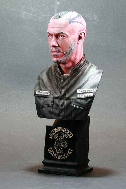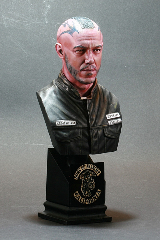 Hier hat sich bei der letzten Büste der Modelleur gedacht, er sculpted die Badges auf der Lederjacke mit, was ich aber persönlich nicht so gut finde. Ich wollte sie aber auch nicht abschleifen, weil sie bei meinem Sohn in der letzten Reihe steht. Juice Ortiz, gespielt von Theo Rossi, ist ja auch nur ein Anwärter. Hier habe ich zum ersten mal Tattoos gemalt, war eine echte Herausforderung für mich - das Ganze auch noch freihand! Da sind wir doch mal gespannt, ob noch mehr Charaktere aus der Serie gesculpted werden...