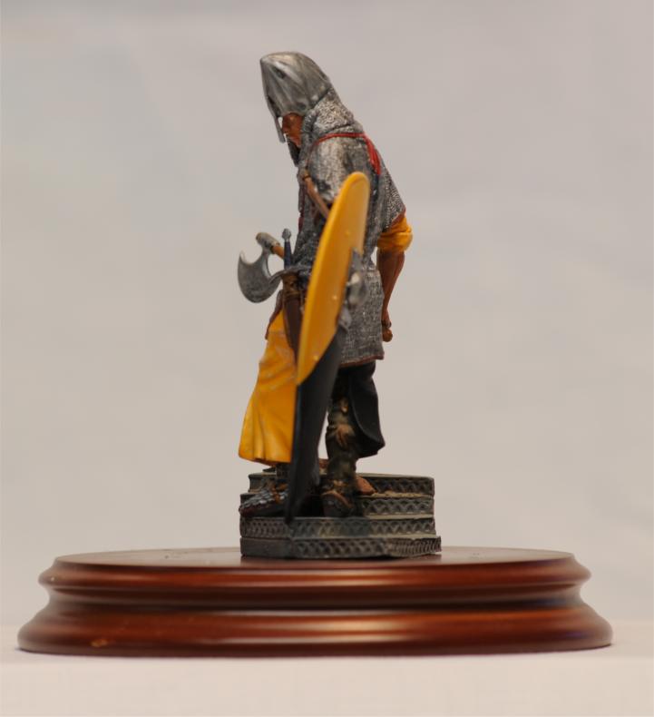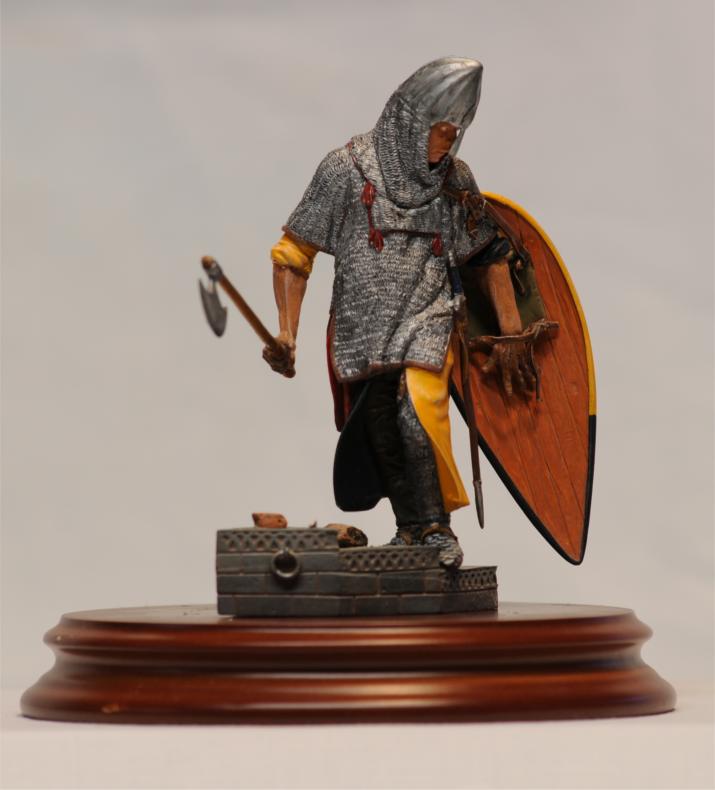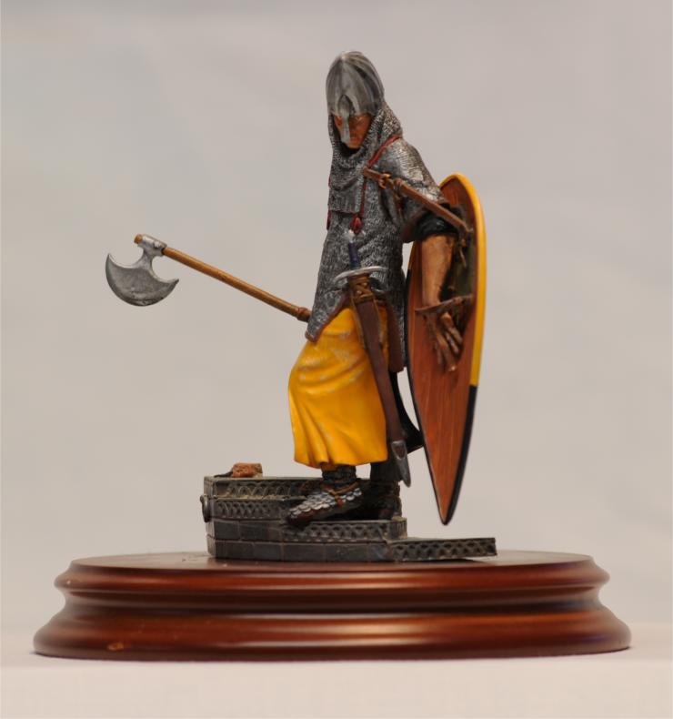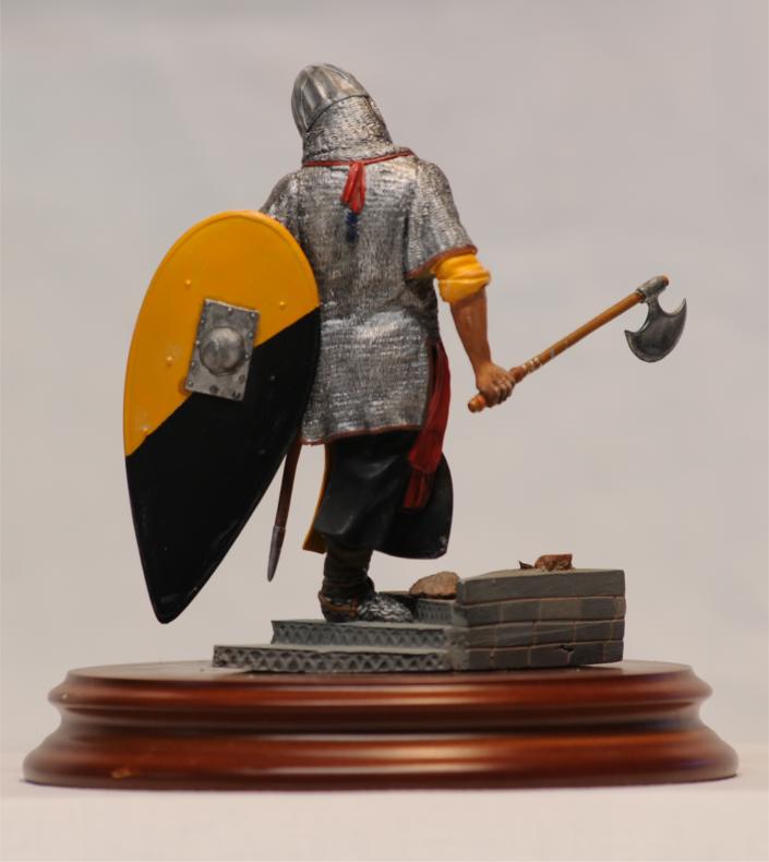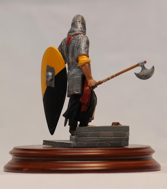 An diesem Normannen aus Süditalien im Jahre 1150 wollte ich mich versuchen. Damals fing für mich als Einsteiger die Schwierigkeit schon mit der Suche nach dem richtigen Kleber für die Vollfigur aus Zinn an. Irgendwie hat es geklappt, es war aber kein Sekundenkleber. Es zeigte sich, dass die Figur zu schwer ist und sich mit Zeit umbog durch ihr Eigengewicht. Irgendwann habe ich dann eine Stütze in Form eines Steins eingebaut.