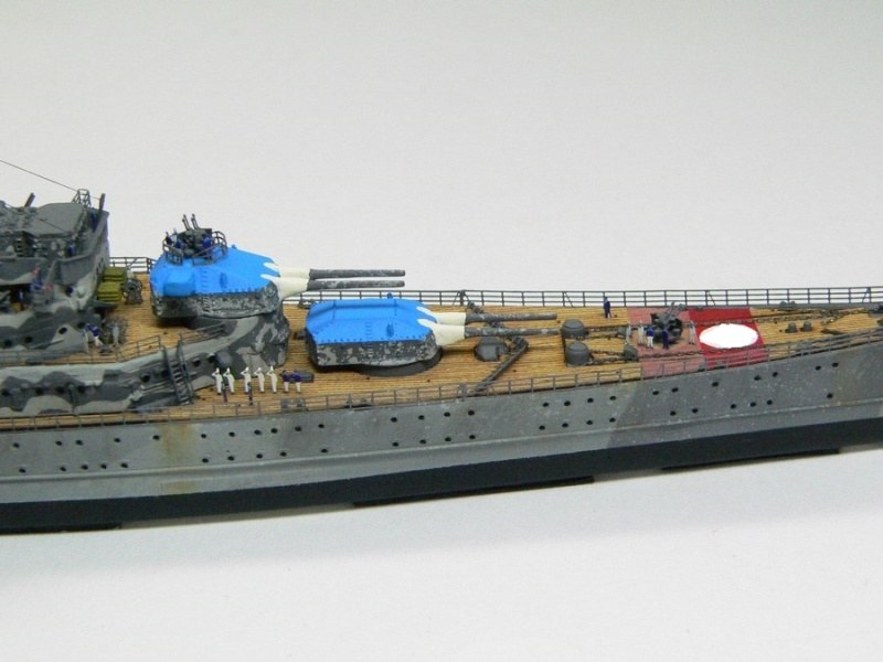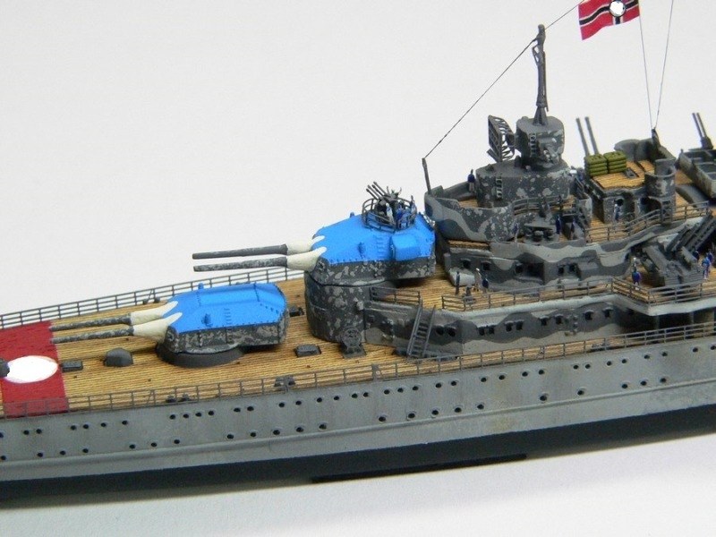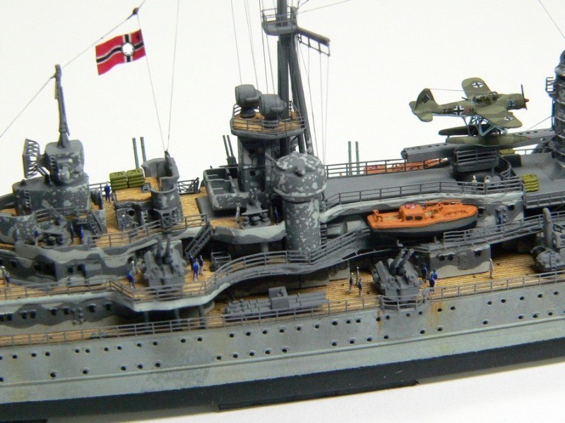 Letztendlich ist es mir aber recht gut gelungen, wie ich finde. Immer wieder überlasieren, antüpfeln, Filter aufsprühen... Die Fliegersichtfelder/IFF-Kennungen habe ich auf das Holzdeck auflackiert. Besonderheit hierbei war, dass auf dem Hauptdeck die alten HK-Bänder notdürftig entfernt bzw. überstrichen wurden und sich auf der Mitte des HK achtern und auf der Back jeweils eine 2cm Vierlings-Flak befand! Die Fliegerkennungen hatte man etwas versetzt, unmittelbar vor dem Kanaldurchbruch, komplett neu aufgebracht. Ich habe HKs von Peddinghaus verwendet. Die dem Kit beigefügten Decals waren deutlich zu groß und mit den breiten roten Bändern wohl eher dem „Unternehmen Rheinübung" zugedacht.