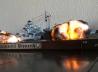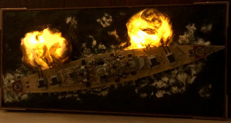 Bismarck feuert Breitseite!Ein Revell Bausatz im Maßstab 1:350 mit Ätzteilen an den Aufbauten und Echtholzdeck. Für die Wasserdarstellung diente wieder eine Styroporplatte, in die ich die Wellen eingeformt habe. Danach habe ich mit schwarzen Acryllack die Grundfarbe des Wassers hergestellt. Bei den Wellen und Bugwelle habe ich zur Darstellung noch Watte verwendet. Die Umrandung sind Mahagonileisten.