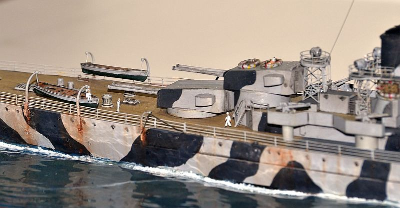 Bei der Bemalung entschied ich mich für das Tarnmuster, welches das Schiff doch attraktiver für das Auge werden ließ. Auch die Sache mit dem Altern will gelernt sein. Für ein Schiff, welches nicht so viele Einsätze hinter sich hatte, bevor es versenkt wurde, sieht es ein wenig zu mitgenommen aus. Wirkt aber auf der anderen Seite auch nicht steril.