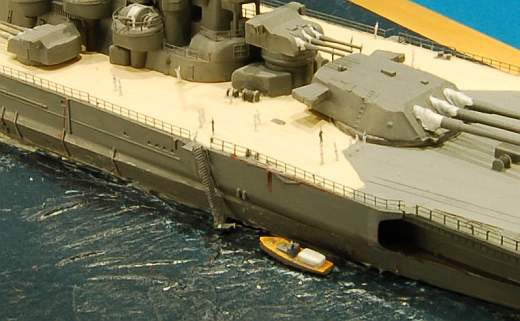 Das Diorama:Zu sehen ist die Probe für den Wechsel des Flaggschiffes von Admiral Yamamoto von der NAGATO zur YAMATO am 12. Februar 1942. Verkehrsboote pendeln schon einmal zwischen den beiden Schiffen. Mitglieder der Besatzung befinden sich am Heck und bereiten die Probe für die Zeremonie des Flaggschiffwechsels von Admiral Yamamoto vor. Das Wasser ist aus Tapetenkleister / Haushaltstücher angefertigt, Stichwort „Kieler Wasser“. Ein Holzrahmen schließt das Diorama ab.