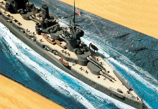 Die Entstehungsgeschichte der Yamashiro konntet Ihr im Modellfan 5/2003 lesen. Ich möchte Euch das Ende dieses Schiffes erzählen. Als die Yamashiro und ihr Schwesterschiff die Fuso neuzeitlichen Anforderungen nicht mehr genügte, entschloß man sich in den 30er Jahren zum Totalumbau. Hierbei wurde unter anderem die Schiffslänge vergrößert, auf Ölfeuerung umgestellt, ein Katapult an Bord genommen und moderne Fla-Waffen installiert. Der Umbau veränderte das Aussehen der Schiffe erheblich. Der vordere Schornstein fiel weg. Sie erhielten einen pagodenförmigen Turmmast, welcher auf beiden Schiffen aber ganz unterschiedlich ausgeführt war. Auf der Yamashiro nahm dieser Turmmast wesentlich mehr Grundfläche als auf der Fuso ein. Dies ist der Grund, warum bei der Yamashiro der Turm C in Zurrstellung nach Achtern zeigt und bei der Fuso nach vorne zeigt. Mit diesem Aussehen sind beide Schiffe in den Krieg getreten. Sie gehörten zur 1. Flotte und wurden unter anderen bei der Midway-Operation als Fernsicherung für die Aleuten-Landung vorgesehen. Die japanische Marine erwägte 1943/44 beide Schiffe in Hybridträger um zu bauen ähnlich wie die Ise-Klasse. Der Mangel an Flugzeugen verhinderte dies aber. Statt dessen wurde aber wegen der wachsenden Bedrohung aus der Luft die Anzahl der leichten Flak bis auf über 90 Rohre verstärkt. Dies konnte das Ende nicht verhindern, welches bei den Operationen um Leyte, Philippinen, im Oktober 1944 beiden Schiffe ereilte. Beide Schiffe gehörten zur Südgruppe Nishimura, welche die amerikanische Landungsflotte zum Ziel hatte. Auf dem Anmarschweg wurden Sie am 24. Oktober in der Sulu-See von Trägerflugzeugen angegriffen, welches beide Schiffe überstanden. Anschließend wurden sie aber bei dem Nachtgefecht in der Surigao-Straße von mehreren US-Schlachtschiffen versenkt.