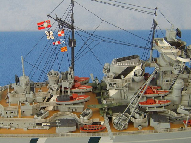 Die äußerst übersichtliche und leicht verständliche Bauanleitung erlaubt die Wahl zwischen zwei verschiedenen Bemalungen des Schiffes in unterschiedlichen Einsatzzeiträumen – der Anstrich im Herbst 1940 und der im Mai 1941. Ich entschied mich für erstere Möglichkeit und bemalte das gesamte Modell entsprechend mit Pinsel, wobei ich mich weitgehend nach den sehr zutreffenden Farbvorgaben des Bauplans richtete.