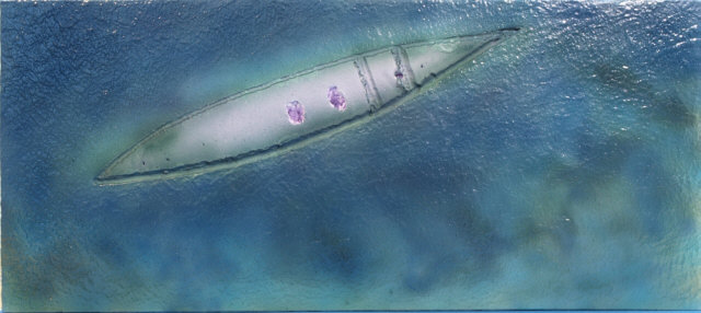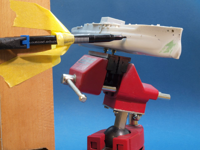 Ausfüllen der überflüssigen Befestigungslöcher Die BasisNun konnte es an den Bau des Dioramas gehen. Hierzu wurde der Rumpf im Schraubstock in den gewünschten Winkel geneigt und eine Schnittlinie angezeichnet. Unterschiedliche Bilder des Wracks zeigen unterschiedliche Neigungszustände, so dass ich mir einen aussuchte, mit dem ich mich wohlfühlte. Aus Furcht, dass der Rumpf sich nach dem Absägen verziehen könnte, ging ich dabei etwas umständlich vor: Es wurden Segmente aus dem Unterwasserschiff herausgesägt und dann jeweils Versteifungen aus Gussästen eingeklebt, bevor das Unterwasserschiff vollends entfernt wurde. Nach dem Versäubern der Schnittkante wurde das Modell mit beiger Emailfarbe grundiert – diese haftet gut am Kunststoff und ich benötigte sie als Untergrund für meine Holzdecks. Das Diorama entstand aus meinem üblichen IKEA-Rahmen, in den ein Stück Hartschaumplatte aus dem Baumarkt eingepasst wurde. Das Modell wurde darauf diagonal platziert, es wurden Bohrungen für die Halteschrauben eingebracht und der Umfang des Modells an der Wasserlinie wurde etwas aus der Platte ausgefräst, damit es möglichst satt auf ihr lag. Die Hartschaumplatte wurde nun mit weißer Wandfarbe und einem Heizkörperpinsel stippelnd bemalt, um eine leicht unregelmäßige Oberfläche zu erzielen. Ich hatte einen sonnigen Frühlingstag mit ruhiger See vor Augen, deshalb wurde die Platte nicht weiter strukturiert. Nachdem die Wandfarbe getrocknet war, ging es an die Farbgebung. Ich schaute mir die Fotos an, die ich in Cornwall gemacht hatte, und versuchte Schritt für Schritt diesem Eindruck nahe zu kommen. Ich wollte unterschiedlich tiefe Bereiche andeuten, solche mit verborgenen Felsen und solche mit stärkerem Bewuchs. Auf den Fotos sieht man den Weg, den ich dabei gegangen bin. Es wurden unterschiedliche Acrylfarben jeweils mit der Airbrush aufgebracht. Nachdem dieser Schritt abgeschlossen war und die Farben gut durchgetrocknet waren, wurde die Basis mit zahlreichen Schichten lösungsmittelbasiertem hochglänzendem Klarlack aus der Spraydose überzogen, bis der gewünschte Glanzgrad erreicht war. Erst dieser Schritt schafft die Illusion einer Wasserfläche und bringt die Basis zum Leben. So nett das aussah, es fehlte noch etwas; also probierte ich, aus Stücken der Hartschaumplatte Felsen herzustellen. Mit einer Säge, ein paar Feilen und Schleifstäben formte ich einige kleinere Felsen und ein größeres Stück, das in der Ecke platziert und dort ein Stück der cornischen Küste spielen sollte. Die Teile wurden mit diversen Grautönen von Vallejo ModelAir gespritzt und dann mit Ölfarbe trockengemalt, wozu helleres Grau und an der Wasserlinie Grün verwendet wurden. Die fertigen Felsen wurden mit klarem Acrylgel auf der Basis verklebt, das um die Felsen herum mit einem Spatel ausmodelliert wurde. Nach dem Durchtrocknen wurde hier mit weißer Ölfarbe dezent trockengemalt, um aufgewühltes Wasser darzustellen. Schließlich war ich zufrieden und wandte mich wieder dem Schiff zu.