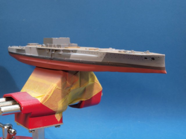 ... und weiter ...Ein Vorteil dieses Projekts lag darin, dass ich mich mit vielem erst gar nicht abgeben musste. Weder musste ich knifflige Pom-poms oder Radargeräte aus mikroskopischen Ätzteilen zusammenbetteln, noch musste ich zahlreiche Beiboote detaillieren – eine ganze Menge Zeug fehlte einfach. Andererseits musste ich zusehen, was ich mit den ganzen leeren Flächen machte. Die „Structural Parts 2“ von L´Arsénal erwiesen sich wieder einmal als sehr nützlich – mit den runden Ätzteilen konnte ich z.B. frühere Geschützstellungen markieren. Die zahlreichen runden Splitterschilde um die ehemaligen 20 mm – Positionen wurden großteils mit Polystyrolrohrmaterial nachgebildet, das von innen vorsichtig dünner gefräst wurde. Die Bausatzteile der diversen Feuerleitstände und Entfernungsmesser wurden gemäß den Zeichnungen im AOTS-Band nachdetailliert, ebenso die 15-Zoll-Türme. Hier wurden auch gemäß Vorbildfotos die Öffnungen an den Türmen A und Y abgedeckt; Weißleim und Farbe deuteten eine Segeltuchbespannung an. Die Masten entstanden aus konischen Messingstäben von BMK, Ätzteilen und Messingdraht, sowie ein paar selbstgebauten Zutaten wie der Radarlaterne. Nachdem ich die angespritzten Ankerketten entfernt hatte, erneuerte ich die Kettenwege aus Resten einer Ätzteilplatine. Die Öffnungen für die Ketten wurden ausgebohrt. Geschwärzte Kette von Saemann wurde verwendet. Einigen Aufwand erforderten die sehr feinen Plattformen am Schornstein. Die Drehachsen der daran montierten Scheinwerfer wurden aus Draht ersetzt, um durch die Löcher in den Plattformen zu passen. Nachdem ich mit den Baugruppen soweit gediehen war, konnte ich an das Altern des Modells gehen – einer der Arbeitsschritte, die mir das größte Vergnügen bereitet haben. Ich benutzte Humbrol-Verdünnung, verschiedene Ölfarben in Ocker, Beige, Braun, Grau und Weiß sowie sehr viele Wattestäbchen und einen Pinsel. Damit konnte ich sowohl Washes als auch Akzentuierungen anlegen, ineinander übergehen lassen und korrigieren. Das brachte die Oberflächen erst recht zum Leben und ließ das Schiff zusehends den Vorbildfotos ähneln. Um die Wasserlinie herum wurden auch Grüntöne verwendet (aus Gelb und Blau gemischt), um Algenbewuchs anzudeuten. Allgemein bemühte ich mich, bei aller Stärke der Alterung diese noch stimmig und dezent aussehen zu lassen, weil der kleine Maßstab besonders bei näherer Betrachtung keine übermäßigen Kontraste verzeiht.