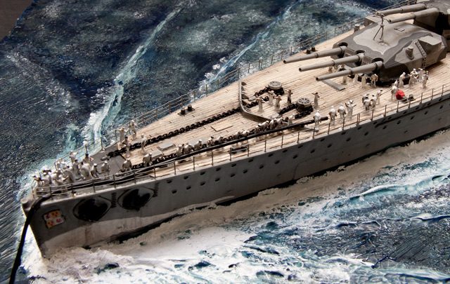 Die IdeeSchon sehr früh im Projekt war mir eines klar: Ich wollte die Graf Spee in einem besonderen Aussehen bauen: Die Geschützattrappe und die Schornsteinattrappe. Im Verlaufe des Bauens entschloss ich mich dazu, zusätzlich auch eine Szene mit einem Treibstoff-Schlauch einzubauen. Ich sah ein Foto davon in den Tagebuchaufzeichnungen von "Rasenack". Er beschrieb auch, wie dies vonstatten ging. Allerdings fährt "meine" Graf Spee viel zu schnell. Ich hätte eine viel ruhigere See darstellen müssen. Wieder was gelernt. Eine andere Situation findet sich im Heck: Offenbar ist eine der Treppen defekt und wird gerade abgesperrt.