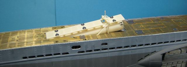 Nach Lackierung der Brücke wurde diese auf dem Turm montiert und das ULAD Decal mit dem Turm - Emblem „3x Schwarzer Kater“ angebracht. Der Schacht für das Luftziel-Sehrohr wurde „scratch“ gebaut, weder das Revell- noch das CMK-Teil waren richtig wiedergegeben. UZO-Säule, Turmluk, der Angriffs-Sehrohrbock und das 2cm Flak Geschütz wurden mit Hilfe von CMK und Eduard Teilen, einem Schatton Geschützrohr, sowie viel Eigenbau völlig neu konstruiert. Für das Luftzielsehrohr wurde das Revell-Teil gewählt, das Angriffssehrohr kam aus dem CMK (Exterior Set Part1 - Turret) und wurde noch mit 0,1 mm Kupferdraht um die herumgedrehten „Stahlseile“ ergänzt, welche die Wasserwirbel und Vibrationen bei Sehrohrbetrieb verringerten. Damit war der Turmaufbau abgeschlossen und dieser wurde auf den Rumpf montiert.
