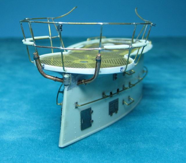 Der TurmFür den Turm wurde zunächst ein Druckkörper mit Einstieg und einige Entlüftungen hergestellt, da man diese später durch das Turmdeck hindurch sehen kann. Aus dem Revell-Bausatz wurden nur die Turmhälften und die beiden Hälften der Brücke verwendet, alles andere ist leider völlig unzureichend und teilweise primitiv detailliert, so dass ich es nicht verbauen wollte. Die Turmhälften wurden komplett überarbeitet: alle Klappen weggeschliffen und durch Eduard und U-Brass Ätzteile ersetzt, diverse Öffnungen erstellt, Reling und Aufstiege aus Messingdraht neu gebaut, der gesamte Bereich der Hecklaterne und diese selbst umgestaltet, die Isolatoren für die Antennenleitungen und letztendlich das Turmdeck aus dem Modelbrass Set eingebaut. Dieses wurde ebenfalls verändert, denn die Ösen für die Befestigung der „Wintergarten“-Reling sind für das Revell-Teil ausgelegt, welches viel zu dick ist und daher nicht von mir verwendet wurde. Außerdem findet man diese Ösen am Original nicht. Somit wurden sie weggeschliffen und eine Umrahmung aus Plastikstreifen hergestellt. Für die Wintergartenreling wurde in der Bohrmaschine eine Schablone aus Holz gedreht und damit eine Neue aus 0,6 mm Messingdraht gelötet. Nach einigen zusätzlichen Deck-Details im Brückenbereich wurde der Turm samt Deck lackiert.