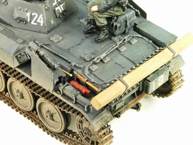 Alle Sichtblenden am Turm wurden durch Dragonteile ersetzt. Danach zog ich alle Schweißnähte nach und versah die Turmluke mit Winkelspiegel und einem Kopfpolster. Anschließend wurden die Werkzeuge angebracht. Die Nebelmittelwurfbecher erhielten die für die Flammabteilung 100 typischen Schutzbleche und Verschlüsse von K98 Karabinern. Zum Schluss erhielt der Panzer noch einen Holzbalken und Reservekanister.