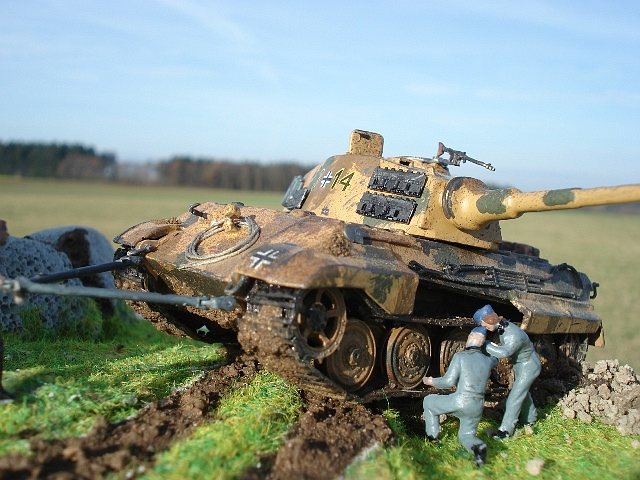Die hier gezeigte Szene stellt einen Famo dar, der mit Einsatzes des Erdsporns und der Winde versucht einen Königstiger (bereits auf MV gezeigt) zu bergen. Das Seil der Winde läuft über einen am Baum befestigten Seilzug um den Panzer aus dem Dreck zu ziehen.