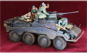Zum Bau:Gebaut wurde der Panzer größtenteils aus der Box. Qualität, Passgenauigkeit und Detaillierung des Kits waren hervorragend. Alleine das Fahrwerk des Modells besteht aus unendlich vielen Einzelteilen (Ein Rad ohne Aufhängung = 4 Teile). Dadurch entstand dann auch die Idee, das Fahrzeug, wie auf dem Bausatzcover, in eingelenktem Zustand darzustellen. Laut Fotos lenkten die Räder alle unterschiedlich stark ein. Außerdem lenkten jeweils zwei Achsen in die Gegenrichtung. Nachdem alles zusammen geklebt war, wurde an einigen wenigen Stellen noch ein wenig gespachtelt und geschliffen. Die Antennen wurden durch gezogene Gießäste ersetzt. Das sehr dünne Kanonenrohr wurde mit einem sehr kleinen Bohrer geöffnet. Das MG spendierte ebenfalls ein gezogener Gießast. Eine der Klappen zu den Staukästen in den Kotflügeln auf der linken Seite wurde geöffnet dargestellt. Das einzige Teil, das ein wenig geändert werden musste, waren der rechte und linke Kotflügel.