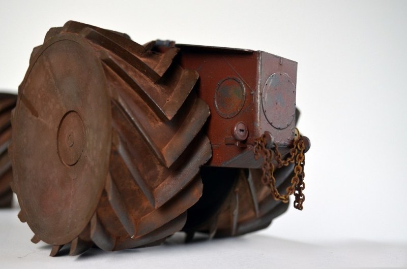 Sobald alle Teile bemalt, gealtert und mit jeglichen zu ergänzenden Details fertig gestellt sind, werden die Seitenteile des Fahrerraums montiert und auf dem Unterboden verklebt. Armaturenbrett, Fahrersitz und weitere Kleinteile - teils aus der Restekiste - werden ergänzt und sorgen für weitere interessante "Eyecatcher". Auch Decals aus der Restekiste - Markierungen, Beschriftungen, Hinweistafeln, etc. - werden im Innenraum angebracht. Auf der Außenseite sind an den Klebenähten auch hier wieder Spachtel- und Schleifarbeiten notwendig. Nachdem die verspachtelten Bereiche der beiden Fahrzeugteile verschliffen sind, werden weitere Anbauteile montiert. Die Wartungsklappen am Motorraum, an denen bereits feinste Griffe angegossen sind, werden angebracht, Ösen und Haken, Scheinwerfer (am vorderen Fahrzeugteil) und Rücklicht (am hinteren Fahrzeugteil), Auspuffrohre und Feuerlöscher. Die Kupplung der beiden Fahrzeughälften wird zusammengesetzt und erfordert ein wenig Nacharbeit, um die beiden Fahrzeugteile dann auch beweglich darstellen zu können. Sind diese Teile alle montiert, ist der Lauster Wargel LW-5 bereits lackierbereit. Die großen (massiven) Räder werden zusammengesetzt und separat dann lackiert. Für Fotos ist alles nur unverklebt zusammengestellt.