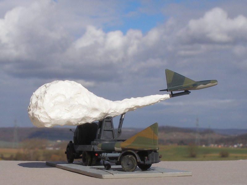 Da der Entwurf des Lenkflugkörpers GB-3/L als Luft-Boden-Waffe floppte (siehe hier), dachte ich mir, dass das Pulso-Delta als Boden-Boden-Waffe brauchbar gewesen sein könnte. So hätte man das von einem Staustrahlrohr angetriebene Geschoss von einer Startrampe aus in die Luft befördern können, während die Steuerung von einem Funkwagen in der Nähe aus erfolgt wäre. Die verwendeten Flugkörper in meinem Modell stammen aus dem Resin-Bausatz von Airmodel Products. Da ein Staustrahltriebwerk eine gewisse Geschwindigkeit benötigt, damit es zünden kann, sollten Rheinmetall Borsig R 109-502 RATO zur Starthilfe dienen. Diese sind ebenfalls im Airmodel-Sortiment zu finden, eigentlich paarweise als Starthilferaketen für Me 262 oder He 162 gedacht.