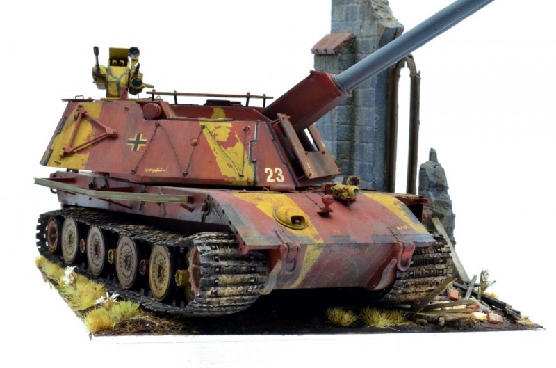 Der Hersteller Amusing Hobby bietet mit dem Panzerkampfwagen E-100 eine Serie der sogenannten Reißbrettpanzer an, die mit verschiedenen Turmvarianten ausgestattet werden. Bei allen Versionen handelt es sich um "What if"-Modelle, die in der Realität nie zum Einsatz gekommen sind. Der Bausatz ist sehr gut detailliert und hervorragend produziert aus hellgrauen Kunststoffteilen ohne jegliche Inneneinrichtung. Die Einzelgliederkette ist klickbar und dadurch beweglich gestaltet. Für das Fahrwerk liegen funktionsfähige Federn aus Kunststoff bei, so dass eine realistische Federung des Panzers darstellbar ist, soll er auf unebenem Gelände platziert werden.