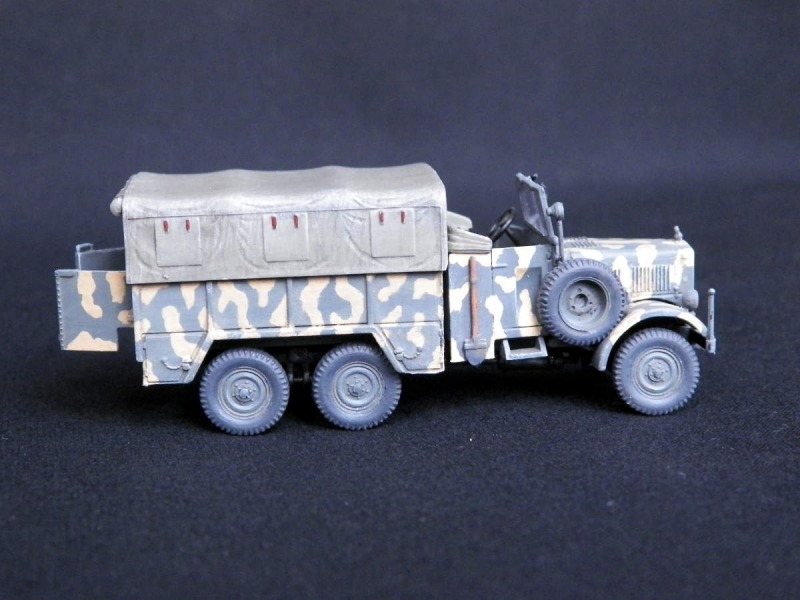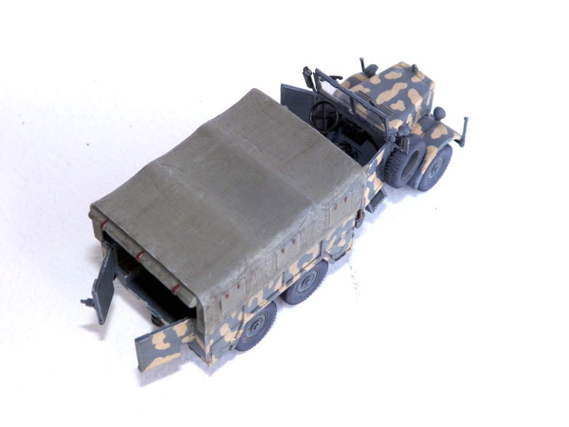 Nachdem ich die Kitbesprechung des Einheitsdiesels von ACE erstellt und mit dem Bau begonne habe, suchte ich das Modell von ZV Models wieder aus der Vitrine. Das hatte ich vor einigen Jahren gebaut und nun gefiel es mir nicht mehr. In Nuts & Bolts Volume 42 "Einheitsdiesel" befinden sich sehr schöne Farbzeichnungen verschiedener Tarnmuster. Spontan entschied ich mich für eine Ausführung von der Ostfront 1943. Und so entstand zwischendurch das neue Tarnmuster auf dem alten Modell. Bei dieser Gelegenheit wurde der fehlende Kanister ergänzt. Er stammt von Value Gear. Nach etwas Trockenmalen und leichtem Washing geht das Modell nun wieder zurück in die Vitrine.