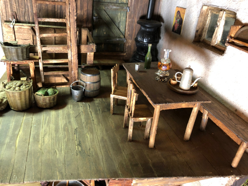 Die Gebäude sind aus Sperr- und Balsaholz, belegt mit einer ca. 2 mm dicken Schicht selbsthärtender Modelliermasse (Steinstrukturen modelliert), Putz der Häuser und Geländeoberfläche mit Wasser und Weißleim gemischter Quarzsand. Möbel Einbau aus Balsaholz und Streichhölzern, Heiligenbildchen (Ikonen) aus dem Internet, skaliert, ausgedruckt und auf Holzbrettchen aufgeklebt.