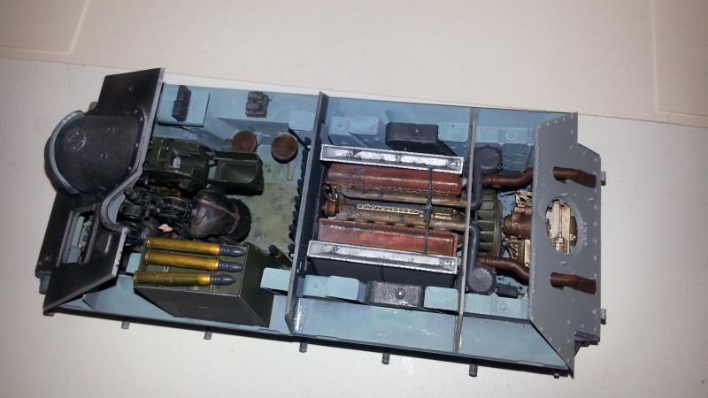 Über die Geschichte dieser Panzerjäger findet man im Netz viele Fotos und Texte, um sich genau zu informieren. Ich habe einige Baustufenfotos gemacht, um zu zeigen, wie beengt es in diesen Fahrzeugen war. Zu sehen sind der Fahrer und der Richtschütze.