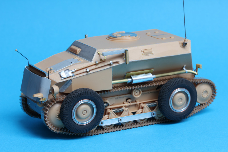 Die Lackierung erfolgte ähnlich wie beim Vorbild. Auf den dunkelgrauen Anstrich (Emailfarbe von Revell), der anschließend mit Tamiyas X-22 Clear versiegelt wurde, habe ich mit einem hartborstigen Pinsel Künstler-Ölfarben unverdünnt nur auf die Karosse aufgetragen. Recht nachlässig durchgeführt, soll diese Schicht den Lehm darstellen, mit dem Anfangs die Fahrzeuge des DAK recht häufig getarnt wurden. Nach ca. zwei Stunden habe ich mit einem leicht mit White Spirit benetzten Pinsel Bereiche, die öfters belastet wurden, frei gerubbelt. Größere Kratzer erzeugte ich mit einem angespitzten Holzstückchen. Es folgten mehrere Schichten sehr stark verdünnten „Staubs“ in verschiedenen Farbvariationen und Intensität, mit Ausnahme der Gleiskette wurden alle Teile des Modells dieser Prozedur unterzogen. Bei der Lackierung der Kette orientierte ich mich an Kettenfahrzeugen, die immer noch regelmäßig in trockenen und sandigen Regionen der Erde bewegt werden. Erst jetzt wurde das Modell komplettiert.