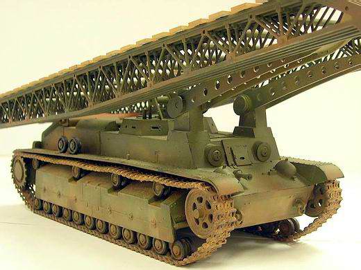 Das Original:Basierend auf dem Kampfpanzer T-28 wurde 1940 in den Kirow-Werken (Leningrad) der Prototyp des IT-28 Brückenleger gebaut. Er war zur Unterstützung der Angriffstruppen gedacht um ihnen die Möglichkeit der Forcierung von natürlichen/künstlichen Hindernissen, aus der Bewegung heraus, zu ermöglichen. Auf der Unterwanne (ohne Turm) wurde dazu eine Vorrichtung zum Transport, sowie zum Ablegen und Aufnehmen der Brückenteile montiert. Zur Selbstverteidigung wurden 2 Maschinengewehre (7,62mm) in die Wannenfront installiert. Nach der Erprobung im Juni 1940 ging der Typ in die Serienproduktion.