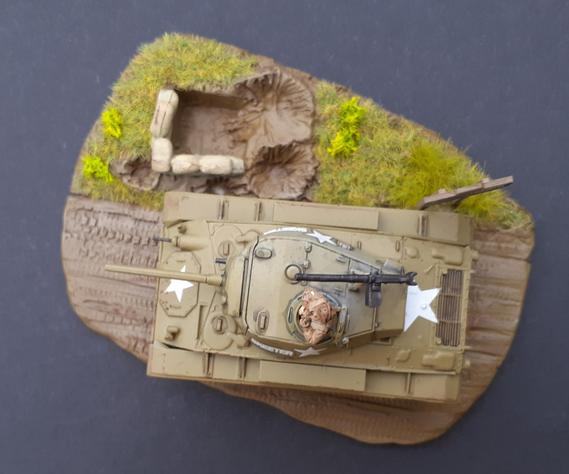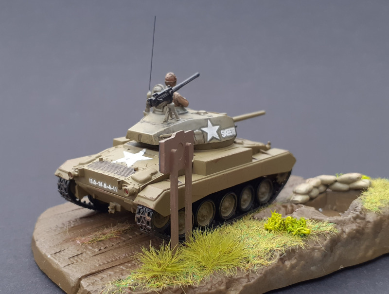 Die nicht mehr zeitgemäßen Gummiketten störten mich nicht. Da keine Figuren enthalten sind, habe ich einen Panzerkommandanten hinzugefügt. Meiner Meinung nach hat dieser das Modell aufgewertet. Noch zu erwähnen ist die kleine Base, um den M24 zu präsentieren. Diese habe ich nach der Bemalung noch mit etwas Modellgras begrünt. Lackiert habe ich den Panzer in US Olivedrab.