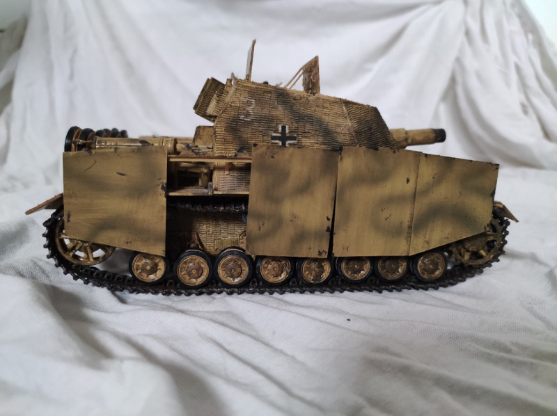 zum Vorbild:Nach den schweren Verlusten während des Unternehmens Zitadelle wurde die Sturmpanzer-Abteilung 216 im Spätherbst 1943 zur Auffrischung nach Österreich verlegt, bevor sie im Februar 1944 als Reaktion auf die alliierte Landung bei Anzio-Nettuno eilig nach Italien beordert wurde. In den zerfurchten Landschaften des italienischen Kriegsschauplatzes mussten die frühen Bauserien des Brummbärs ihre enorme Feuerkraft unter Beweis stellen. Trotz der massiven 15-cm-Sturmhaubitze 43 kämpften die Besatzungen jedoch häufig mit mechanischen Defekten und dem hohen Gewicht des Fahrzeugs, das das Fahrgestell des Panzer IV an seine Belastungsgrenzen brachte, eine Herausforderung, die besonders bei den steilen Etappen der Apennin-Front deutlich wurde. Nachdem die Front bei Monte Cassino zusammengebrochen und der Brückenkopf bei Anzio ausbrechen konnte, deckte der Verband die Rückzugskämpfe in Richtung Rom und später Norditalien, wobei viele Fahrzeuge aufgegeben wurden. Während der Abwehrkämpfe im Jahr 1944, insbesondere im Raum um die „Grüne Linie“ (Gotenstellung), agierte die Abteilung oft in kleinen Gruppen, um direkte Feuerunterstützung gegen befestigte Stellungen der Alliierten zu leisten. Die frühen Fahrzeuge der Abteilung 216 waren dabei optisch besonders markant: Viele trugen noch das typische Zimmerit und wiesen die frühen, fahrerseitigen Sichtschlitze auf, bevor diese in späteren Bauserien durch Periskope ersetzt wurden.