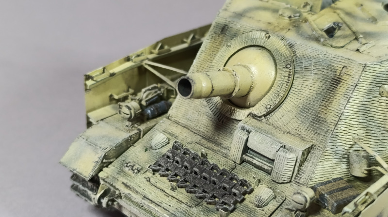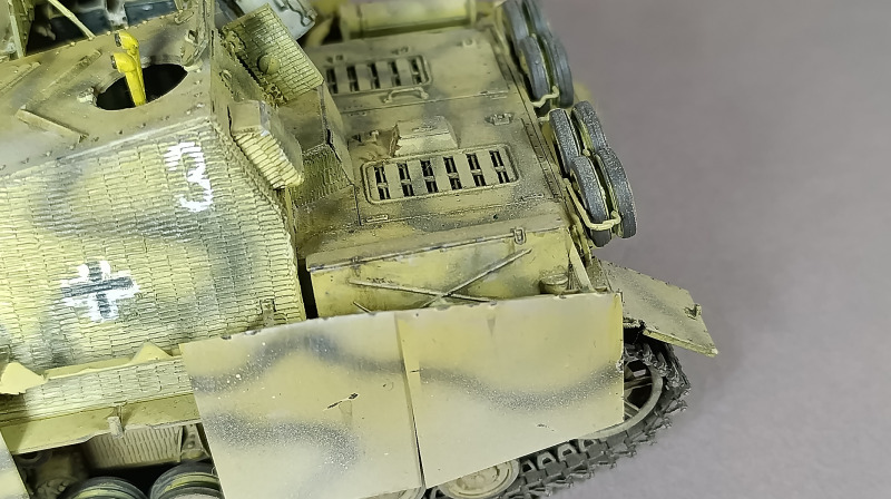 Insgesamt benötigte der Bau jedoch nur wenige Korrekturen und ging beinahe von selbst von der Hand. Mitte Dezember, nach gut drei Wochen, stand der Rohbau. Anschließend lackierte ich das Fahrzeug. Die Tarnung war mir zunächst durchaus gelungen, wurde jedoch durch ein viel zu kräftiges Weathering regelrecht ruiniert. Auch die Abziehbilder hielten auf dem Zimmerit so gut wie gar nicht. Mit Grundierung sowie Glanz- und Mattlack arbeitete ich damals kaum oder gar nicht. Nun ja, Modellbau ist eben ein ständiger Lernprozess. Abschließend wurden noch schnell ein paar Figuren zusammengesetzt und hastig eine Base mit Streugras gestaltet, fertig war die Zwischenlösung, die mir eigentlich nie wirklich gefallen hat.