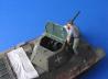 Auch die am Modell dargestellte runde Getriebewartungsklappe auf der Heckpanzerung ist in der Regel erst 1943 eingebaut worden, bei 42er Fahrzeugen hatte sie eine rechteckige Form. Hier wurde aber auf eine Änderung verzichtet, mir ist kein Orginalfoto mit der Heckansicht speziell dieses Beutefahrzeuges bekannt. Die drei Wannenteile leiden etwas unter Verzug und sollten mit dosierter Gewaltanwendung in Form gebogen werden. Auf den Kettenabdeckungen wurde eine Halterung mit Eisgreifern bestückt (aus einem Dragon-Bausatz) und ein Abschleppseil aus verdrilltem Elektrokupferkabel angebracht. Anstelle der etwas widerspenstigen Bausatzkette wurde eine noch vorrätige preisgünstige Einzelgliederkette von RPM verbaut (die aber schon seit einigen Jahren aus dem Lieferprogramm von RPM verschwunden ist). Lackiert wurde mit Airbrush einfarbig russisch-grün, es folgten Washings in Braun und Dunkelgrau, Kanten wurden mit aufgehelltem Grün trockengemalt. Die weißen Fliegererkennungstücher entstanden aus Papiertaschentuch mit verdünntem Holzleim und Flüssigplastikkleber eingestrichen. Decals wurden nicht verwendet, die weißen Kreuze wurden mit einer selbstgefertigten Schablone und aufgetupfter weißer Farbe hergestellt. Zum Schluss wurden Staubablagerungen mit hellbrauner Pastellkreide dargestellt. Weitere Bilder